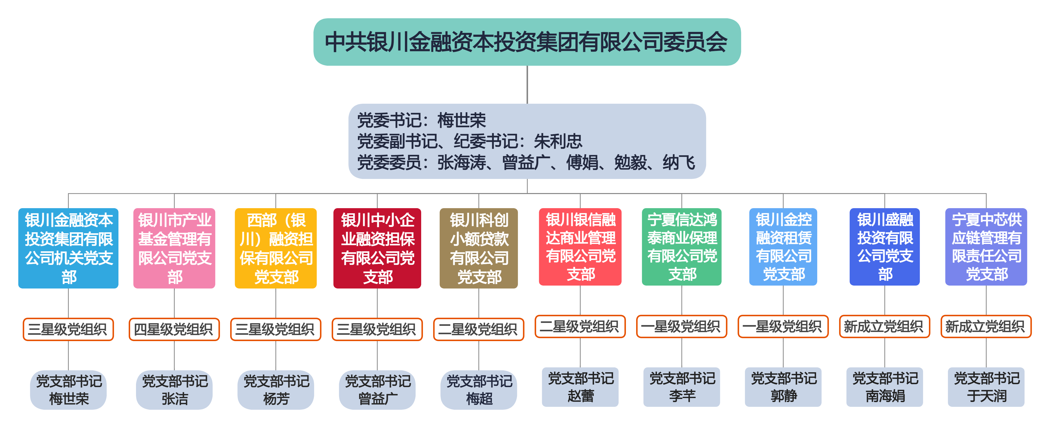 銀川金融資本投資集團有限公司黨委于2019年12月6日成立,在銀川市委、市政府及市國資委黨委和市委金融工委的領(lǐng)導下,堅持以習近平新時代中國特色社會主義思想為指導,堅持正確的政治方向,宣傳貫徹落實黨的路線方針政策,嚴格按照上級有關(guān)部署開展各項工作,有效發(fā)揮黨建在企業(yè)經(jīng)營管理中管大局、把方向的政治引領(lǐng)作用。集團黨委目前設(shè)立10個黨支部:銀川金融資本投資集團有限公司機關(guān)黨支部、西部(銀川)融資擔保有限公司黨支部、銀川市產(chǎn)業(yè)基金管理有限公司黨支部、銀川中小企業(yè)融資擔保有限公司黨支部、銀川科創(chuàng)小額貸款有限公司黨支部、銀川銀信融達商業(yè)管理有限公司黨支部、寧夏信達鴻泰商業(yè)保理公司黨支部、銀川金控融資租賃有限公司黨支部、銀川盛融投資有限公司黨支部、寧夏中芯供應鏈管理有限責任公司黨支部。現(xiàn)有黨員130人,其中正式黨員123人、預備黨員7人、發(fā)展對象5人、積極分子35人。